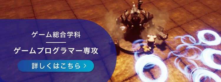ゲーム総合学科のゲームプログラマー専攻では、ゲームプログラマーとして必要な「C#」「C++」といった開発言語から「Unity」や「Unreal Engine」などの開発エンジンの使い方、データベース、ネットワークといったオンラインゲームに欠かせないバックエンドまで、ゲーム開発に必要な知識とスキルをしっかりと身につけます。